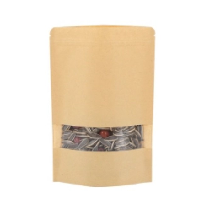 Kraft window doypacks with ziplock for snacks, nuts, coffee, tea and powders. PE/PAPER/PE laminate delivers moisture resistance and sturdy shelf display; optional clear window for on-shelf visibility.